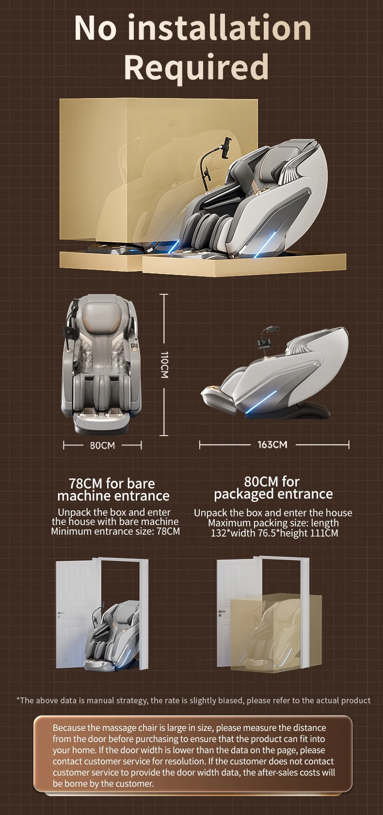 Because the massage chair is large in size, please measure the distance from the door before purchasing to ensure that the product can fit into your home. If the door width is lower than the data on the page, please contact customer service for resolution. If the customer does not contact customer service to provide the door width data, the after-sales costs will be borne by the customer.