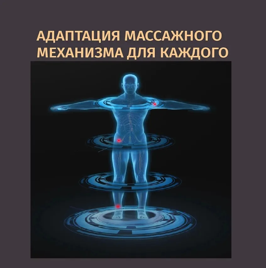 After scanning the body, the chair adapts to the person's body type, allowing for the most accurate workout of all muscle groups (after turning on the chair, do not lift your body off the surface of the massage chair; wait until the scan is complete; the massage chair will notify you with an audible signal).